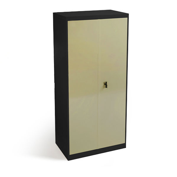 Armario metálico de puertas batientes y 3 estantes graduables. Con 3 bisagras por puerta, cierre de triple falleba y cerradura. Medidas: 1,80 x 0,90 x 0,45.